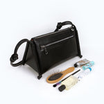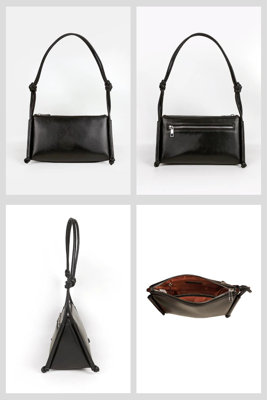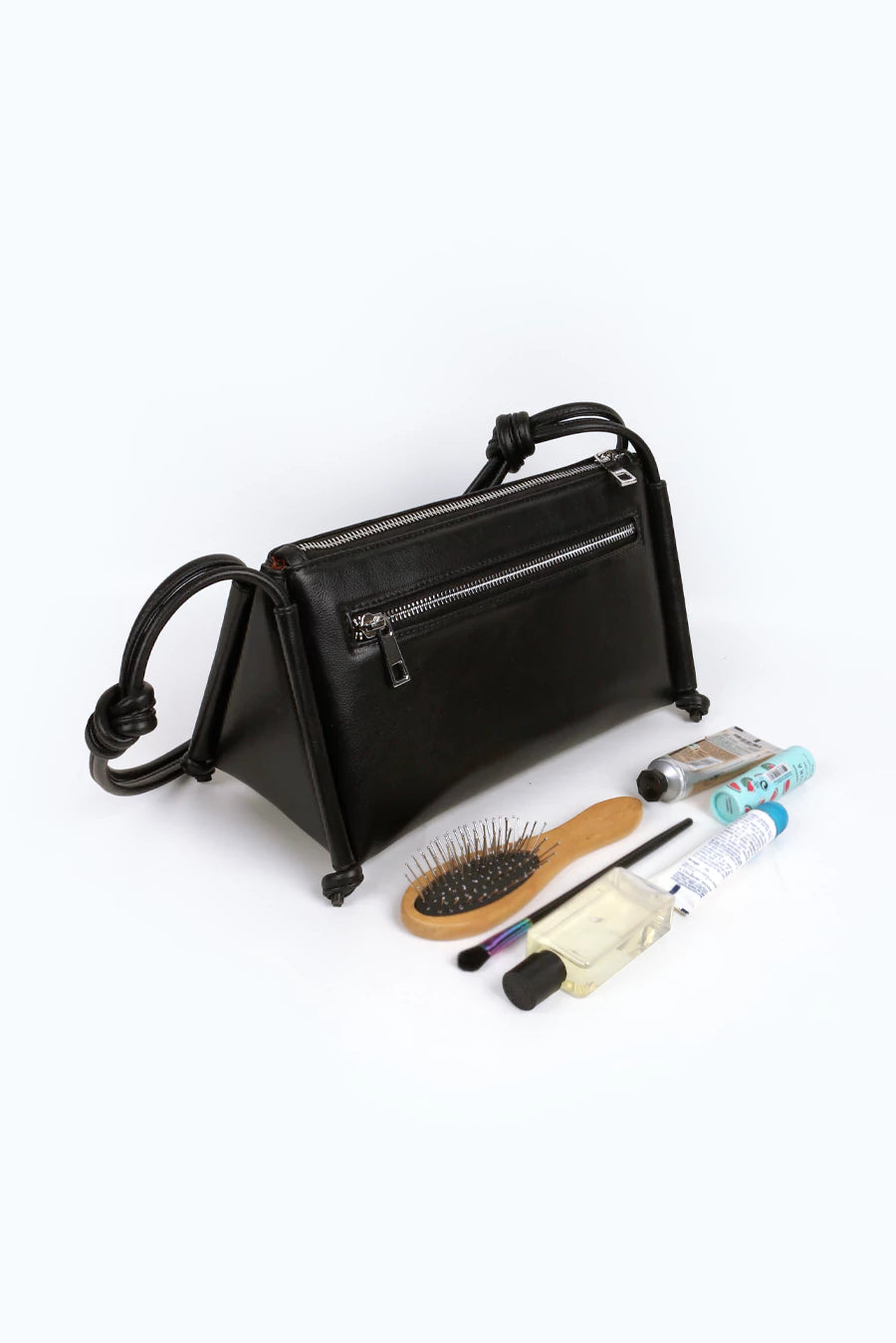 The impeccable construction is defined by two triangles secured by a zip closure to reveal a spacious interior.